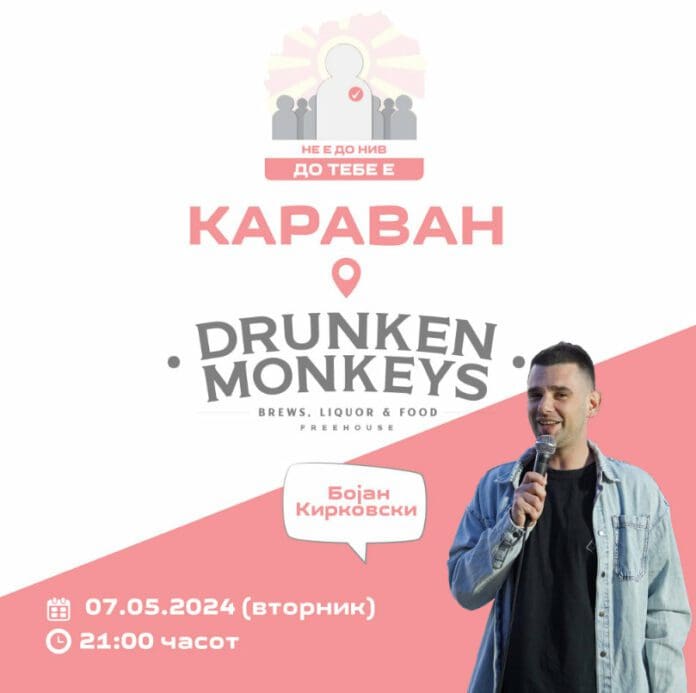 Скопје, 07.05.2024 Вечерва (07.05.2024) караванот „Не е до нив, до тебе е“ патува до својата крајна станица во Drunken Monkeys во Скопје, во 21:00 часот. Диџеј Мац и актерот Бојан Кирковски ви ја закажуваат последната средба и како и досега, ветуваат одлична атмосфера, со добра музика и урнебесна смеа. Дојдете во Drunken Monkeys за да уживате во настапот на Бојан Кирковски и да се потсетите на најважната граѓанска должност, преку моќта на хуморот.