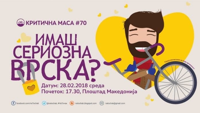 Оваа Критична маса, 70-та по ред ја посветуваме на безбедноста на нашите точаци. Ќе возиме под слоганот „Имаш сериозна врска?“, затоа што секоја „сериозна врска“ со нашиот точак повлекува и сериозна грижа за него во периодот помеѓу две возења и сериозно добар систем на заклучување. Факт е дека велосипедите се лесна жетва за крадците, а за жал бројот на најдени и вратени точаци по кражба е сѐ уште мал.