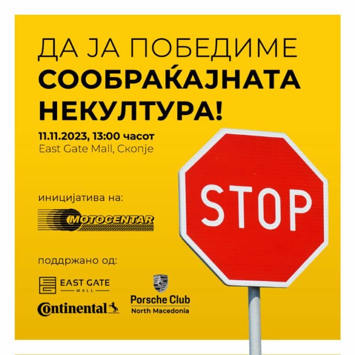 Скопје, 09.11.2023 година – Поттикнати од големиот број сообраќајни незгоди во Скопје кои неретко завршуваат со жртви, „Мотоцентар“, заедно со трговскиот центар „Ист Гејт Мол“ иницираат еднодневен настан, со цел подигнување на јавната свест за важноста на културата во сообраќајот. Именуван како „ДА ЈА ПОБЕДИМЕ СООБРАЌАЈНАТА НЕКУЛТУРА!“, настанот ќе се одржи на 11.11.2023 година (сабота), со почеток од 13:00 часот, на платото пред трговскиот центар „Ист Гејт Мол“ (кај главниот влез).