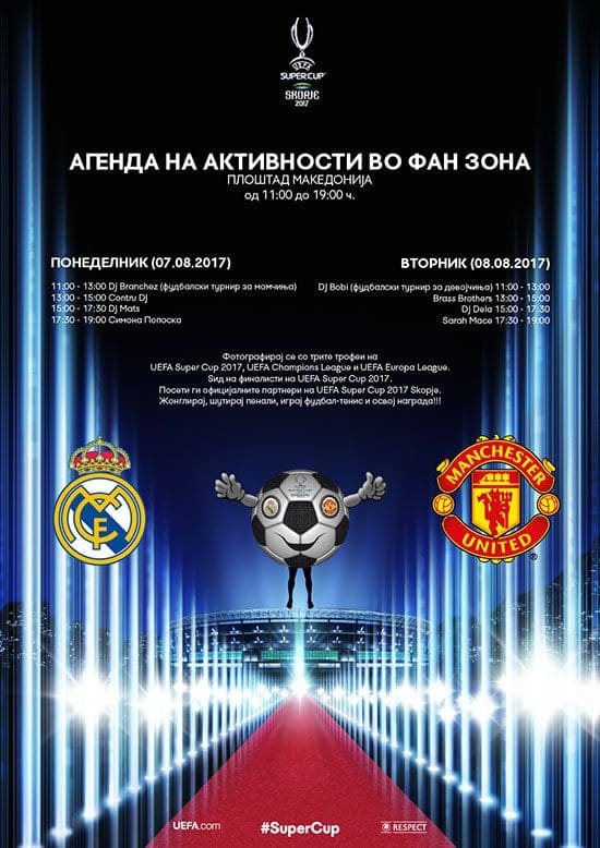 Скопје, (31.07.2017) Во пресрет на УЕФА Супер Купот помеѓу Реал Мадрид и Манчестер Јунајтед, едни од најголемите фудбалски клубови во светот, Град Скопје со полна пареа ги реализира и последните подготовки за активностите во „неутралната фан зона“, која ќе биде лоцирана во центарот на градот на плоштад „Македонија“. Организаторите како и илјадниците обожаватели, со нетрпение го очекуваат овој голем дуел на националната арена „Филип Втори“ кој ќе се оддржи на 8ми август, а за таа цел Град Скопје во соработка со УЕФА, партнерите на УЕФА и ФФМ подготви дводневна богата музичка програма и активности во оваа фан зона.