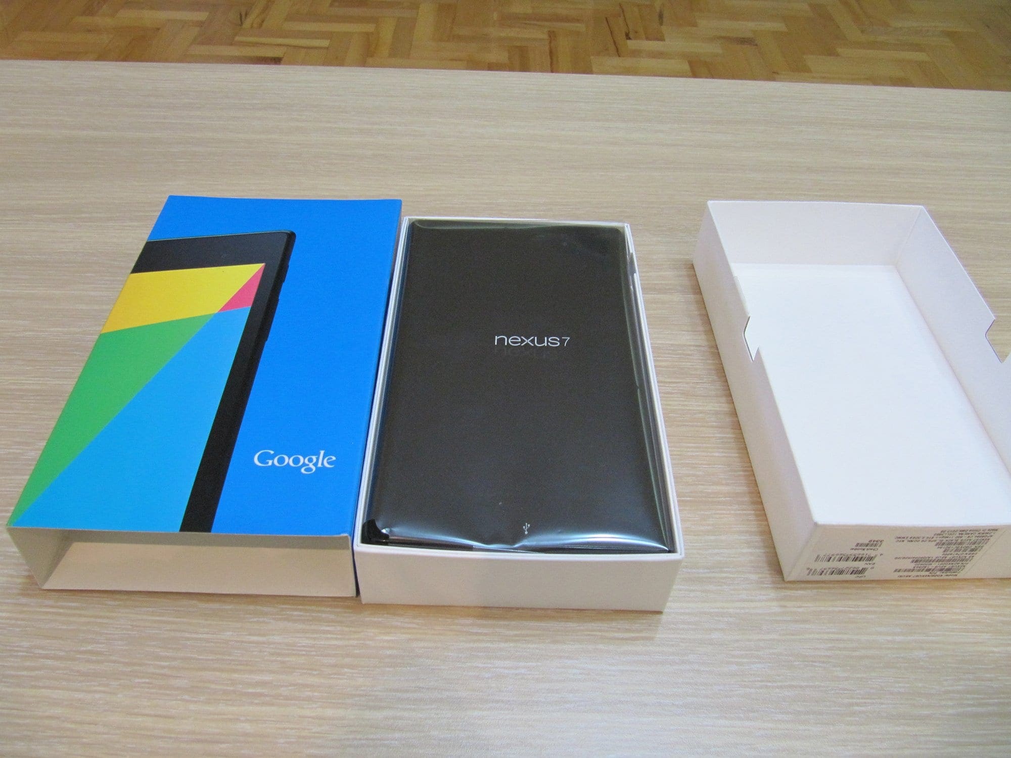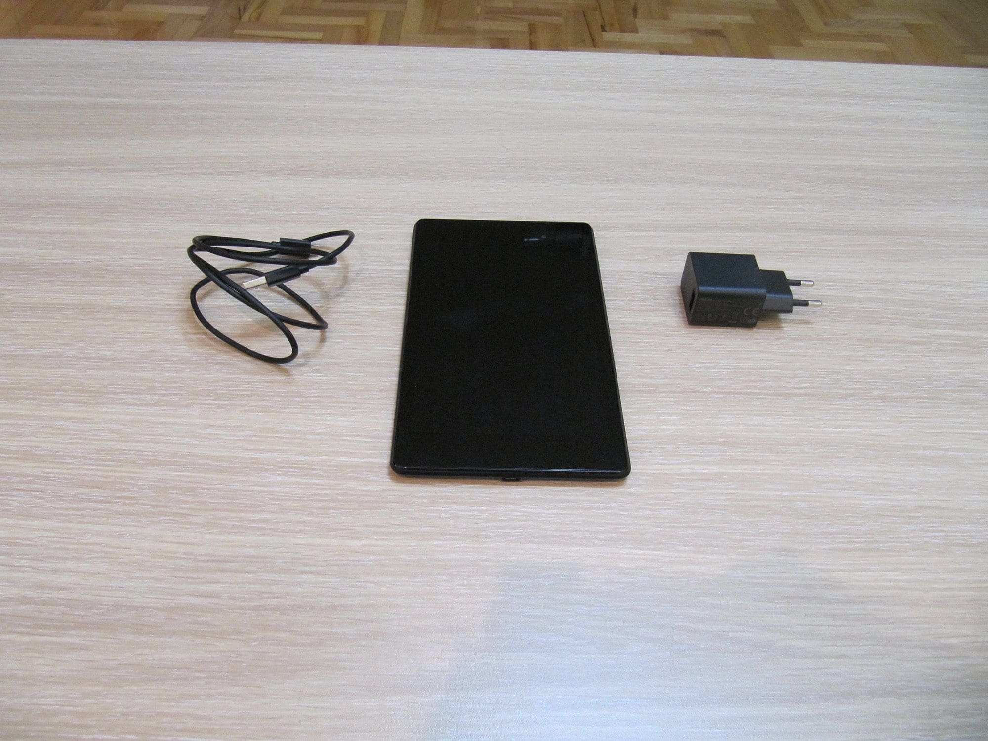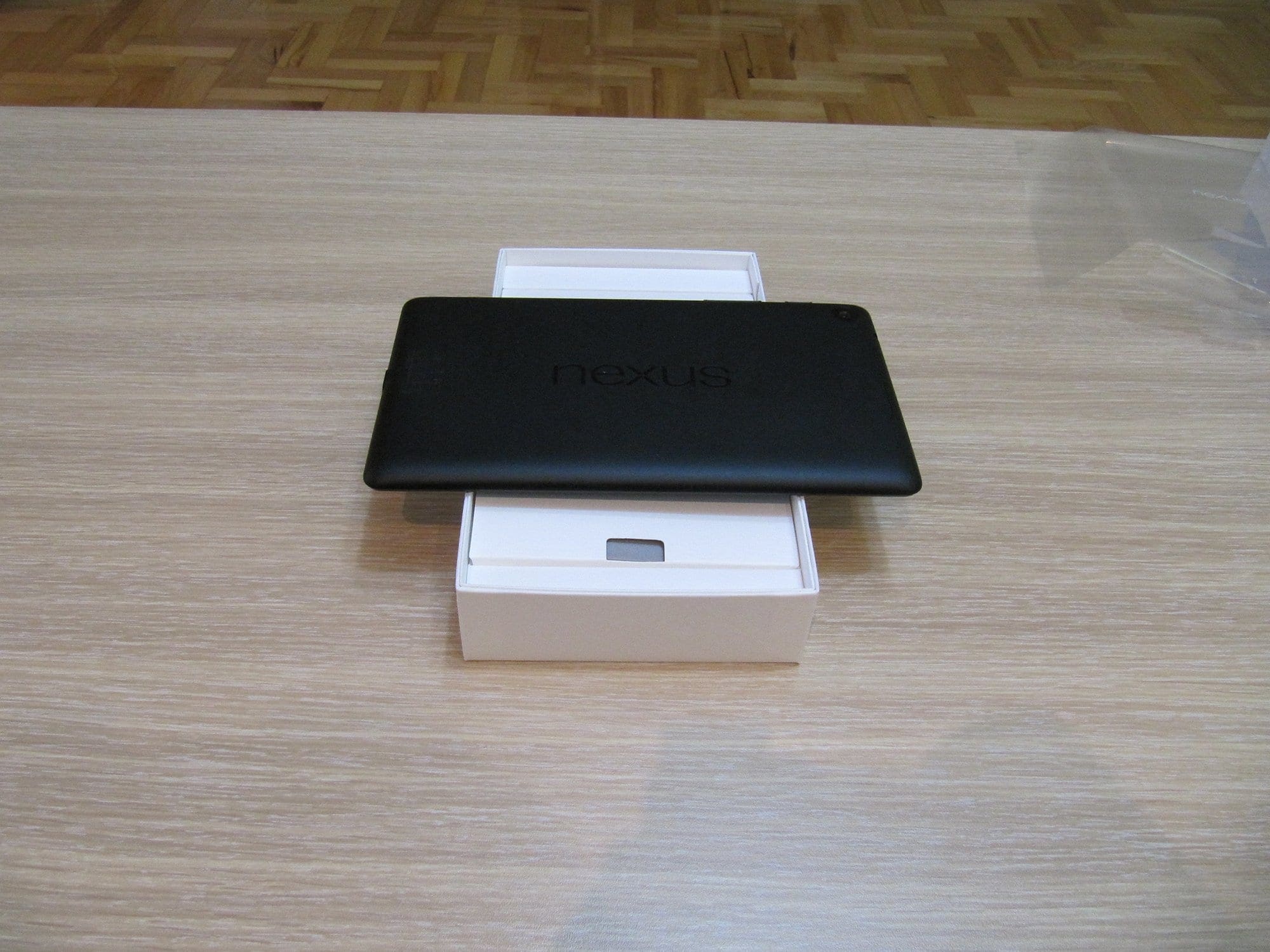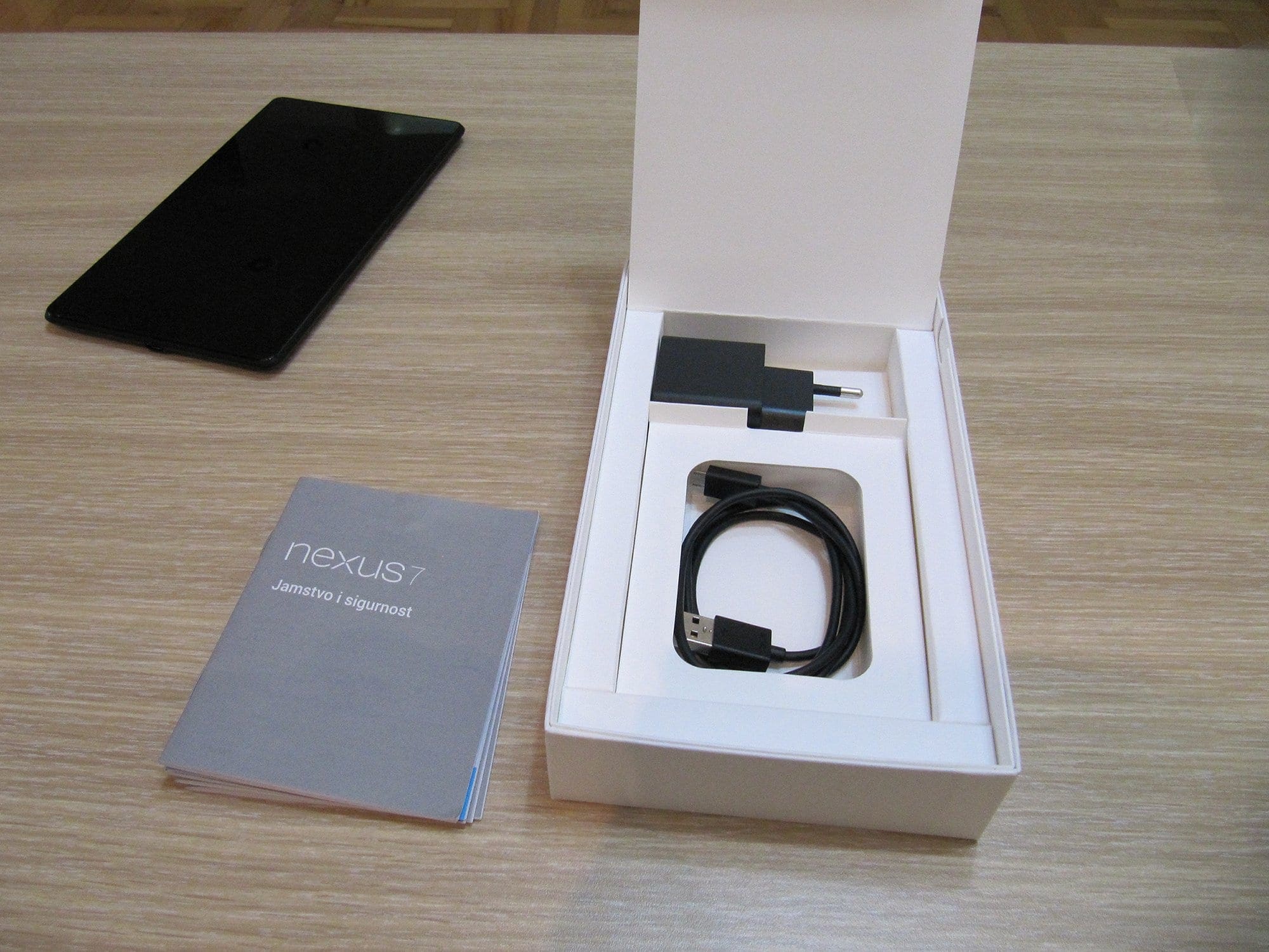 Внатре во кутијата се наоѓа Nexus 7 таблетот замотан во заштитна фолија. Со негово вадење добивате пристап до уште едно помало капаче под кое што се сместени стандардните книгички со информации за гаранција, заштита и кратки упатства. Во пакувањето исто така се наоѓаат адаптерот за струја и USB кабел кој се конектира на адаптерот.