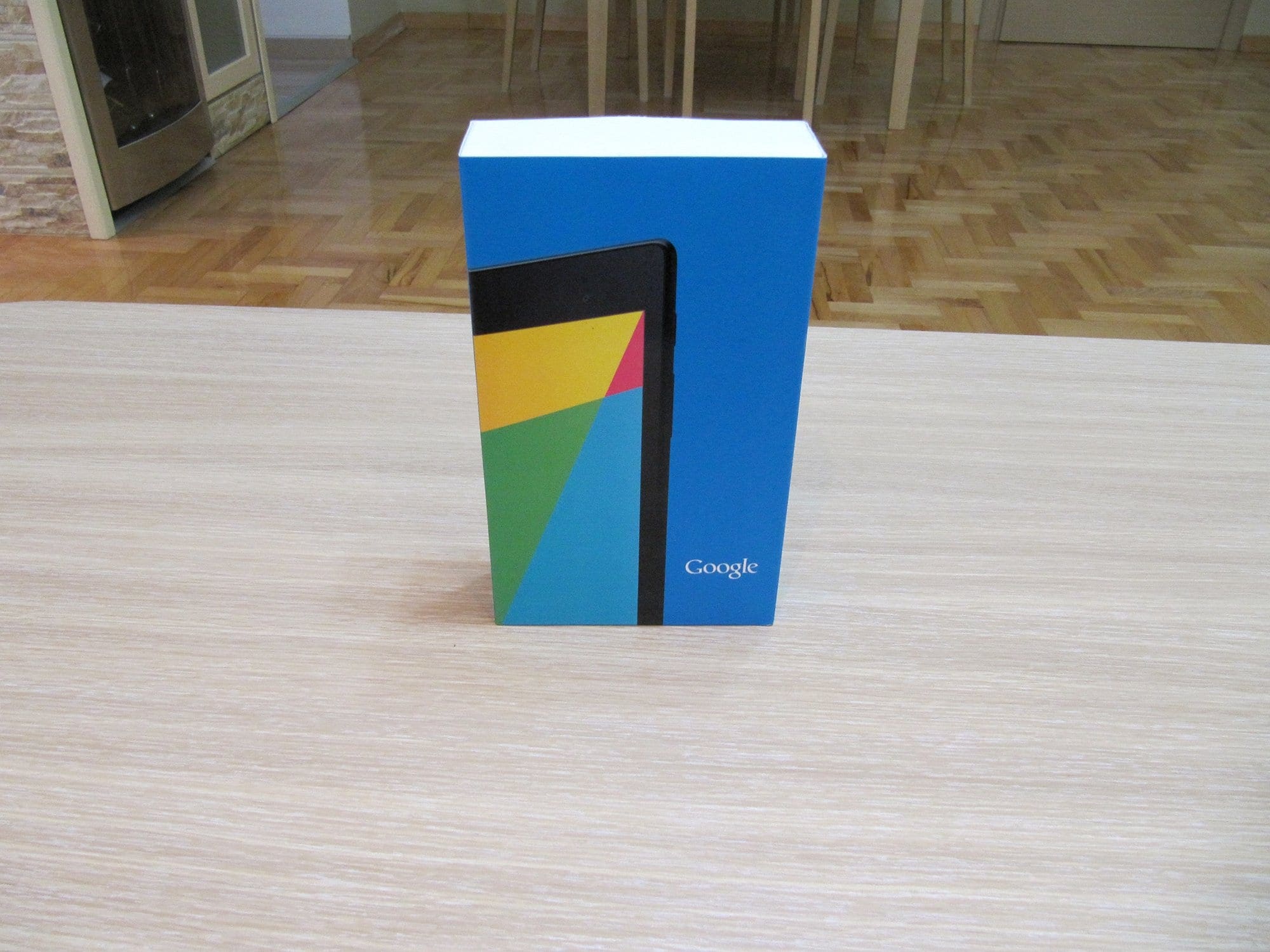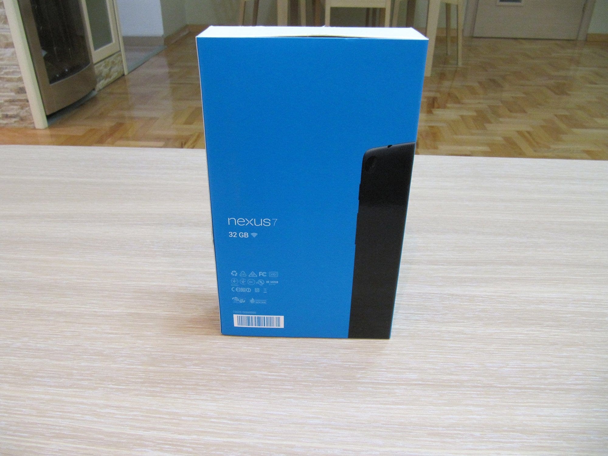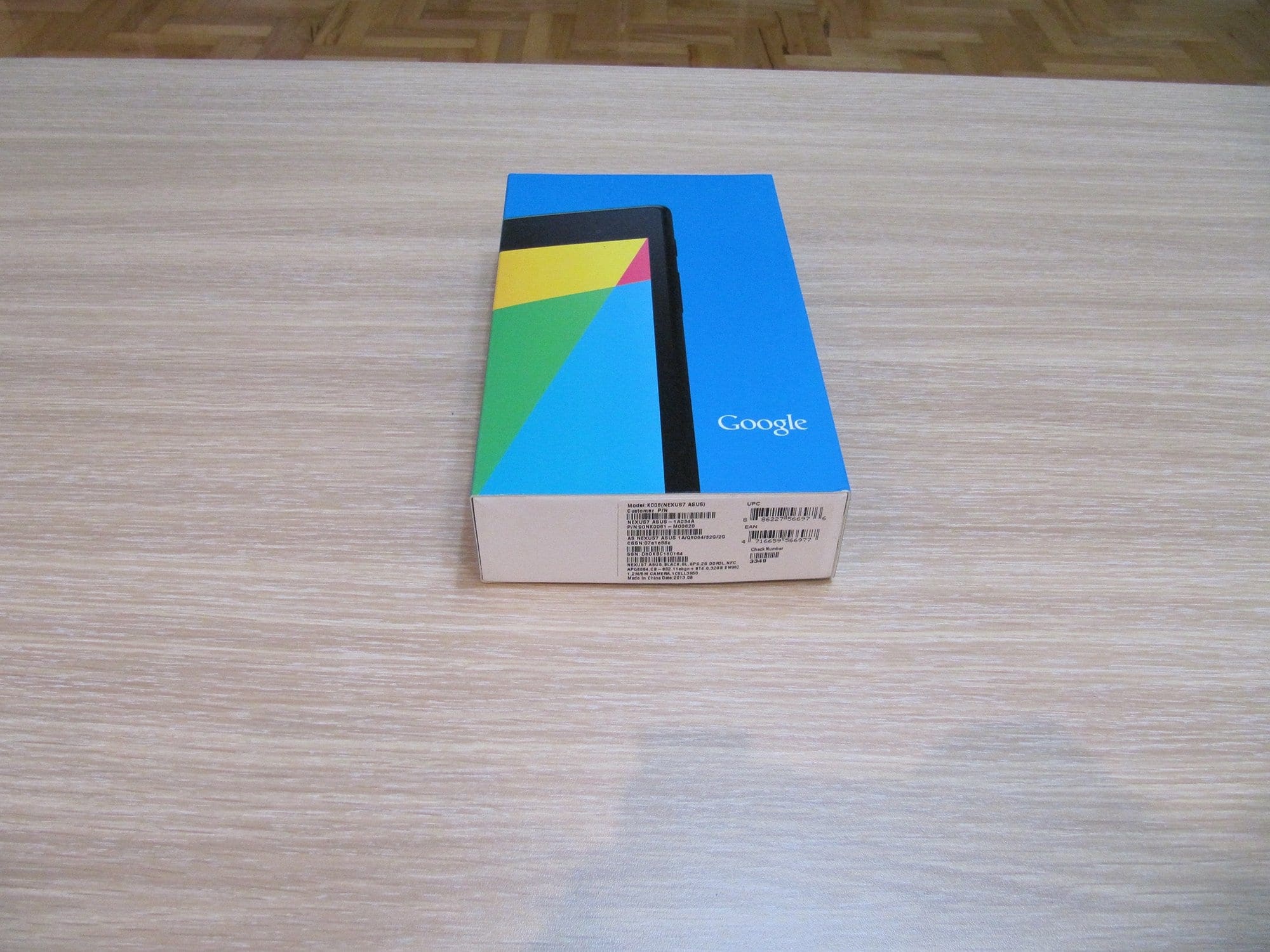 Новиот Nexus 7 доаѓа во сино пакување, за разлика од сивиот дизајн на претходниот модел. На предната страна е испечатена слика од таблетот покрај логото на Google. На задната страна е испишан моделот, во нашиот случај со 32 гигабајти вградена флеш меморија и Wi-Fi, додека 3G логото не е присутно затоа што нашиот модел нема 3G поддршка. Од страните е испишано логото на ASUS кој воедно е производител и на овој модел.
