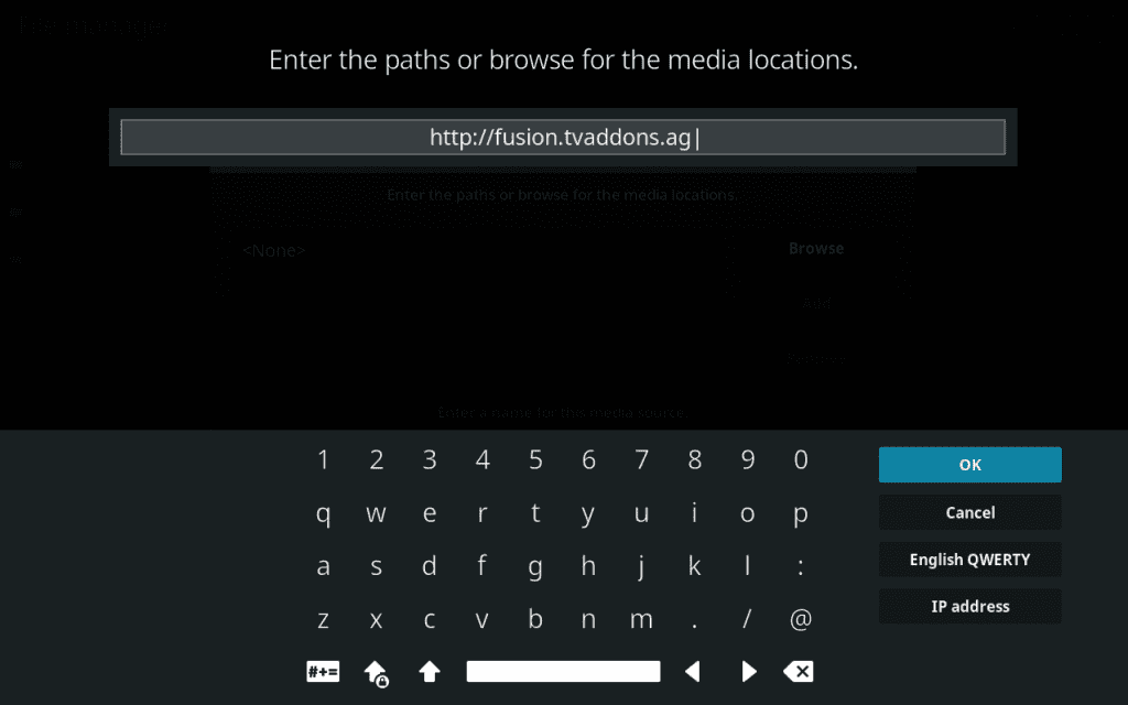- Кликнете None и впишете ја следната адреса: http://fusion.tvaddons.ag, кликнете Done и именувајте ја локацијата fusion и кликнете OK.