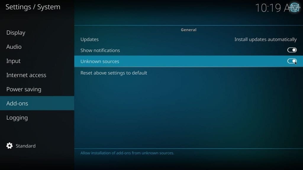 - Кликнете на Gear Icon и селектирајте Unknown Sources од менито Add-ons.