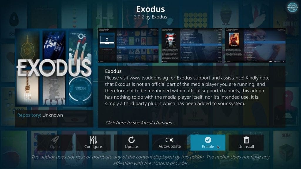 Откако ќе инсталирате некој Source, ќе мора мануелно да го активирате, бидејќи во 17-та верзија на Kodi не се активираате автоматски. За тоа да го направите ќе морате да одите во My Add-ons од Add-ons менито од Home Screen. Кликнете на Video Addons и изберете го саканиот додаток кој што сте го инсталирале за да го активирате и кликнете Enable.