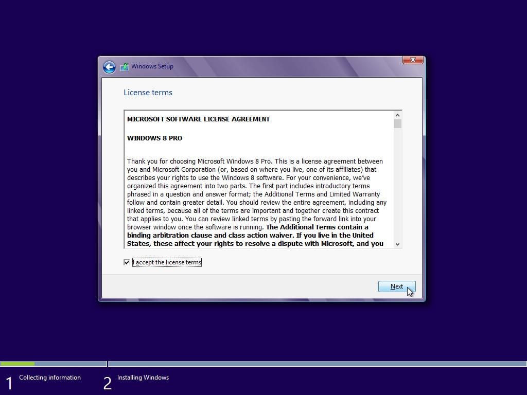 Штиклирајте го полето “I accept the license terms” и притиснете “Next” за да продолжите.