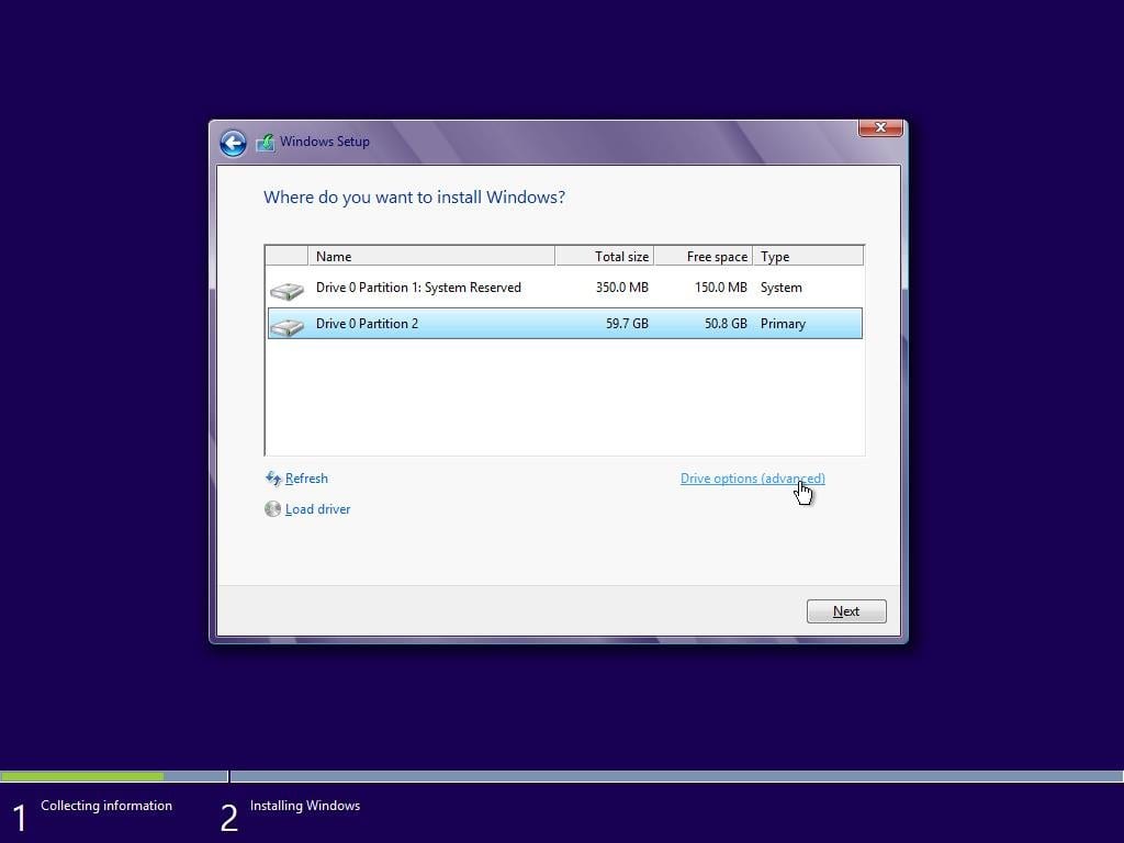 Наредно ќе треба да изберете партиција на која ќе го инсталирате Windows. Притиснете “Drive options” за да креирате нова, односно избришете или форматирате постоечка партиција. Доколку имате креирано RAID конфигурација, преку “Load driver “ опцијата инсталирајте го соодветниот драјвер. За да продолжите притиснете “Next”.