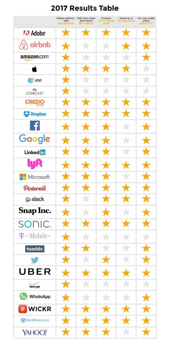 - Секоја од компаниите која што е дел од извештајот има усвоено основни правила за индустријата, како што се објава на извештаи за транспарентност и барање на налог пред да ги дадат корисничките податоци на властите