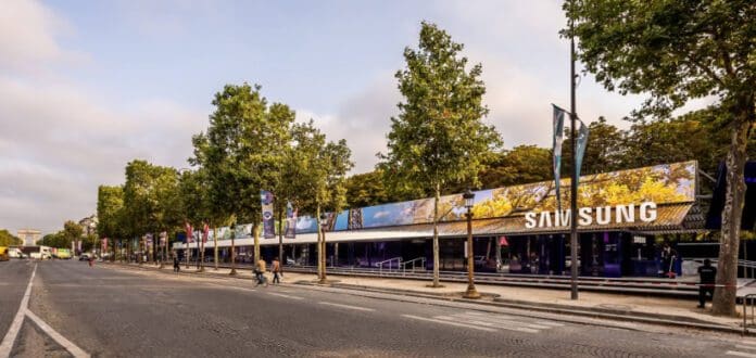 Samsung повторно соработуваше со наградуваниот архитект Жан Нувел (Jean Nouvel), кој, исто така, ја дизајнираше фасадата на просторот на Олимпиското™ рандеву кај Samsung на славните Елисејски полиња, на нова локација на плоштадот Марини, кој се протега од Елисејските полиња до плоштадот Конкорд. Сместен во близина на некои од најпознатите знаменитости во Париз и отворената арена каде што ќе се одржат многу очекуваните натпревари за брејкденс и скејтбординг, просторот може да се пофали со впечатлива стаклена фасада која користи бои и агли за да ја разбуди љубопитноста на посетителите и да им даде поглед на отворениот простор исполнет со светлина каде можат да уживаат во најимерсивното поп-ап искуство на Samsung досега. Мултимедијалната фасада ќе прикажува и слики од спортисти од целиот свет славејќи ја обединувачката моќ на спортот со Samsung Galaxy.