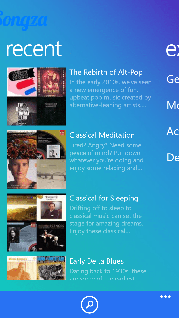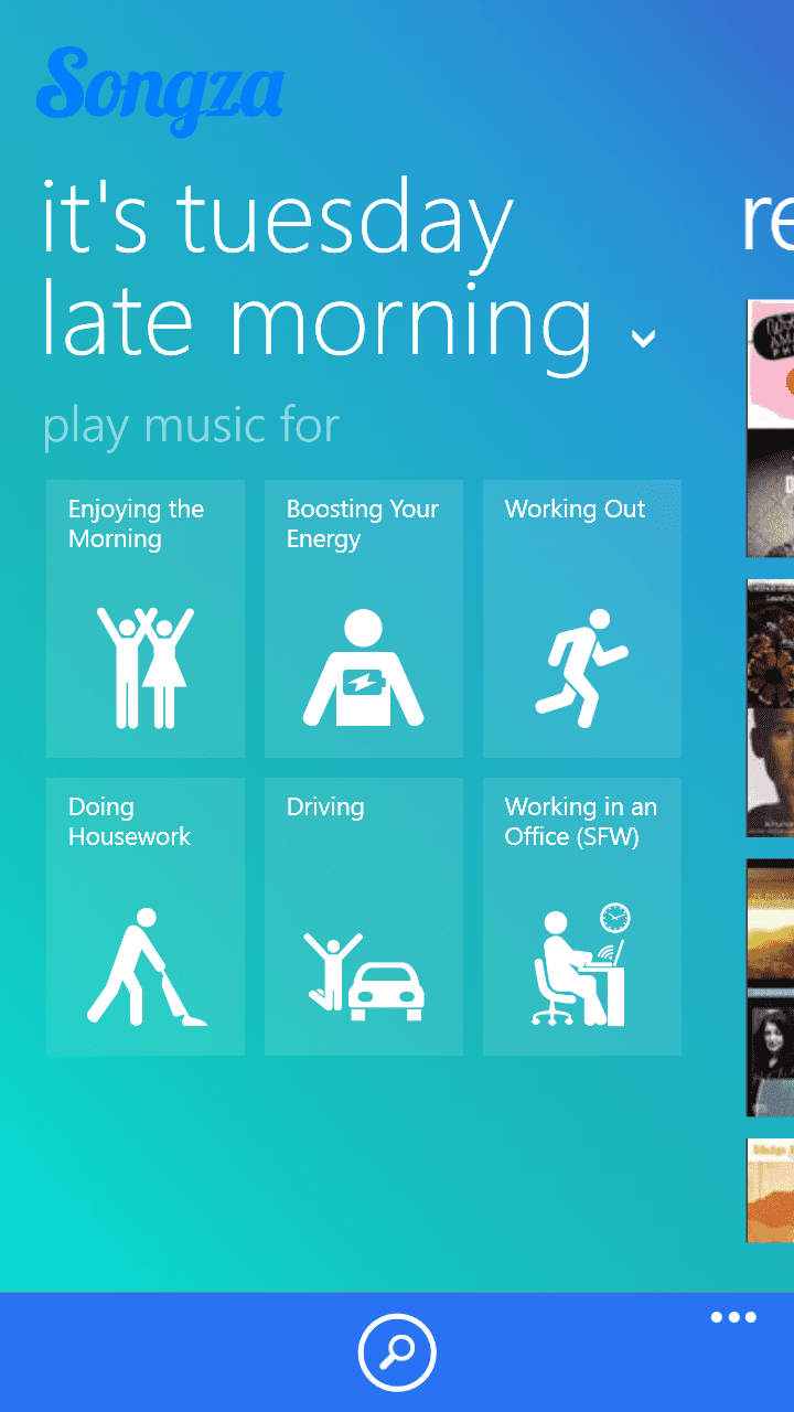 Songza е бесплатен сервис за слушање на музика. За разлика од слични сервиси како Pandora, Spotify и други, Songza ги креира станиците со музика преку избор на жанр, расположение, активности и декади, но не може да внесете име на група или песна. Сепак Songza има интересен и уникатен начин преку кој што доаѓате до интересна музика за слушање. Зависно од денот добивате предлог каков тип на музика сакате да слушате, па така за време на тестирањето на оваа апликација добивме предлог за Вторник Доцна Наутро. За тој период апликацијата дава избор од следните типови на музика: Уживајте во утрото, Појачајте ја вашата енергија, Вежбање, Вршење на домашни работи, Возење, Работа во канцеларија. Музиката што оваа апликација ја нуди во сите нејзини варијанти е избрана од музички експерти, па заедно со вашата оценка за музиката, би требало изборот да биде добро направен.