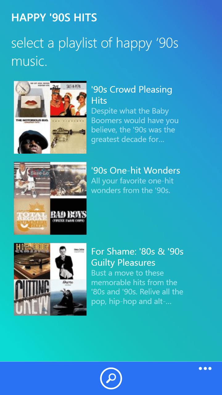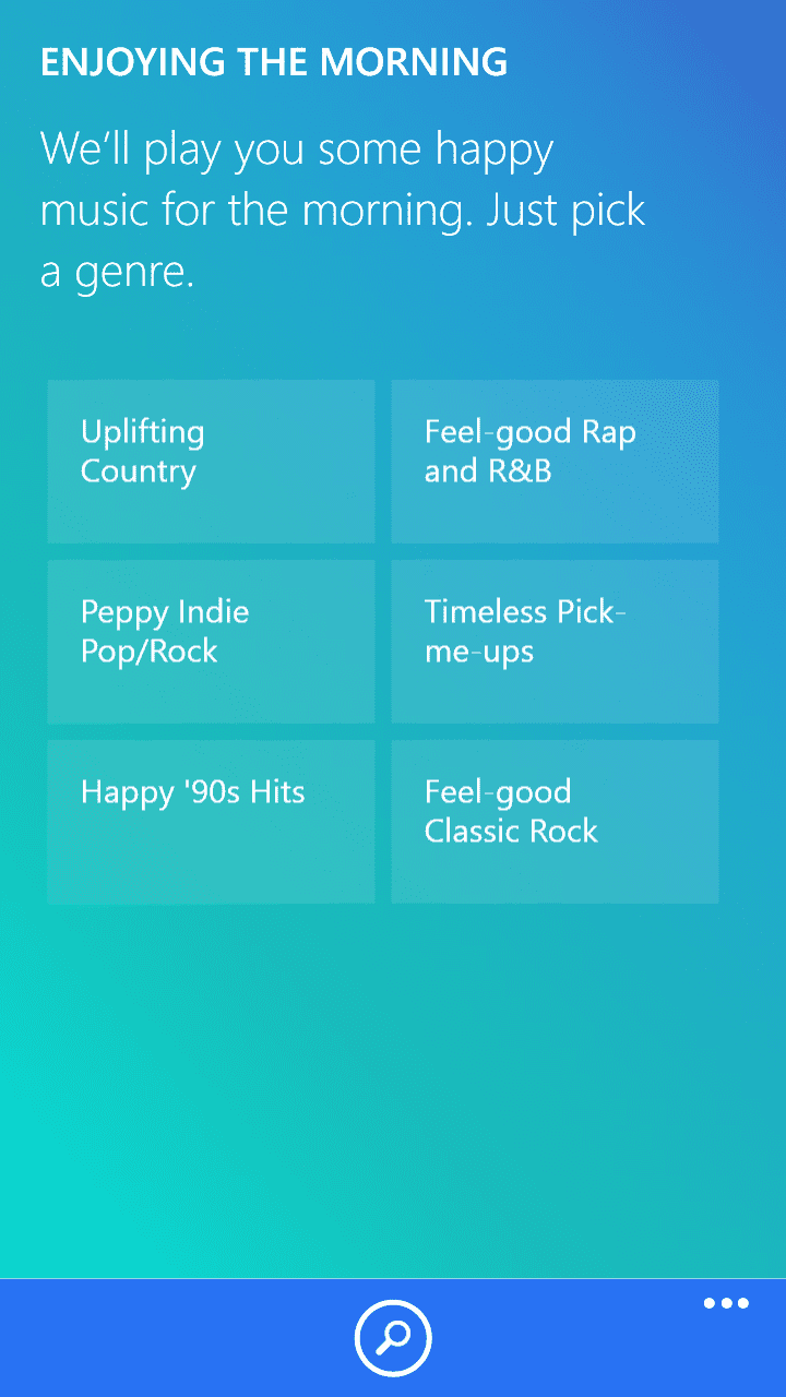Наредниот екран ги има вашите до сега слушани плејлисти, па доколку сакате пак да слушате некоја од нив можете да продолжите без повторно да го правите изборот. На третиот екран правите избор на музика според неколку предложени категории, односно жанр, расположение, активност и декади. Изборот на плејлисти и слушањето на музика понатаму се врши на истиот начин како и со предложените плејлисти зависно од денот.