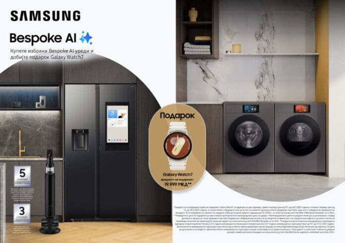 Скопје, 19. мај 2025 – Samsung Electronics неодамна ја претстави својата најнова линија на уреди од бела техника. Суштината на модерните технологии е во поврзаноста, лесната употреба и практичноста, а тоа ја претставува и визијата која Samsung ја донесува, и воедно е причина за новата промоција. Добијте повеќе и поперсонализирано за истите пари за време на промотивните периоди од 19.5. до 26.05.2025, како и од 01.06 до 30.06.2025, и при купување на одредени Samsung фрижидери, машини за перење, машини за сушење или правосмукалки, добијте на подарок Samsung Galaxy Watch7.