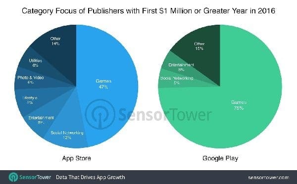 На Google Play Store во 2016 имало 39 издавачи кои успеале да направат милион, а зголемувањето од 2015 е многу поголемо од тоа на Apple, односно 2,8 пати повеќе од 14-те такви издавачи таа година.