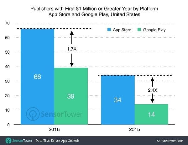 App Store минатата година имала 66 издавачи кои имале приходи од 1 милион или повеќе, скоро дупло повеќе од 2015 кога имало 34 такви издавачи.