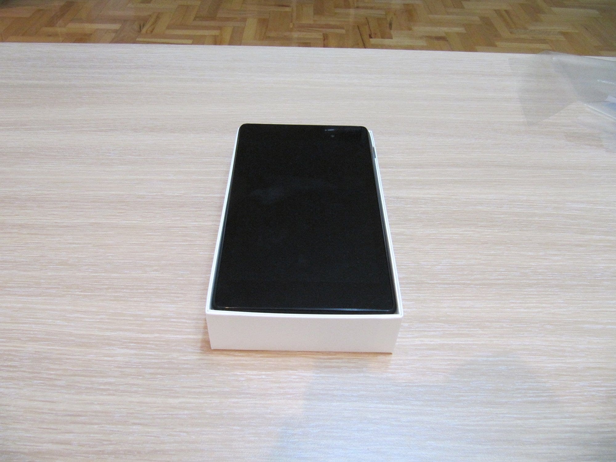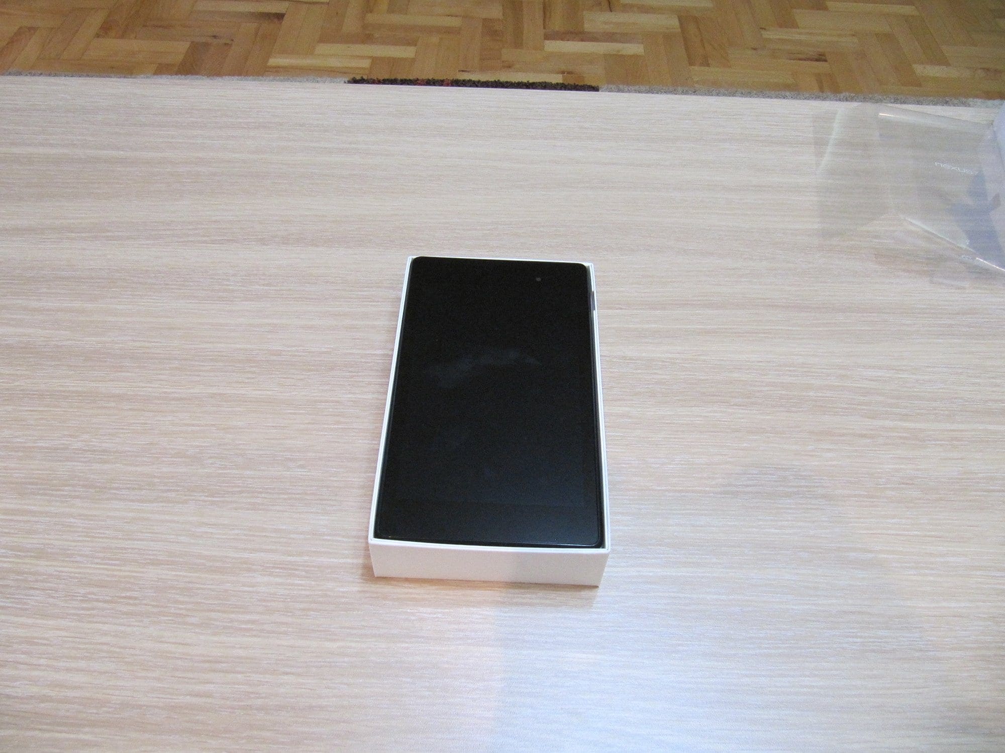 Внатре во кутијата се наоѓа Nexus 7 таблетот замотан во заштитна фолија. Со негово вадење добивате пристап до уште едно помало капаче под кое што се сместени стандардните книгички со информации за гаранција, заштита и кратки упатства. Во пакувањето исто така се наоѓаат адаптерот за струја и USB кабел кој се конектира на адаптерот.